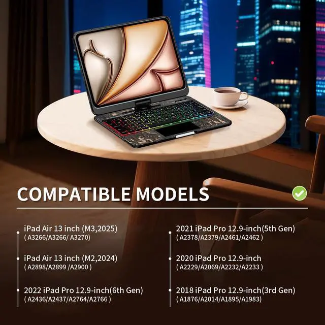 [(Compatibility)] Compatible Only with iPad Air 13" (M3/M2, 2025/2024) and iPad Pro 12.9" (2018/2020/2021/2022) Supports models A2764, A2437, A2436, A2378, A2379, A2461, A2462, A2229, A2069, A2232, A2233, A1876, A2014, A1895, and A1983. Please verify your iPad's model number (starting with "A") on the back of your device before purchasing to ensure compatibility.