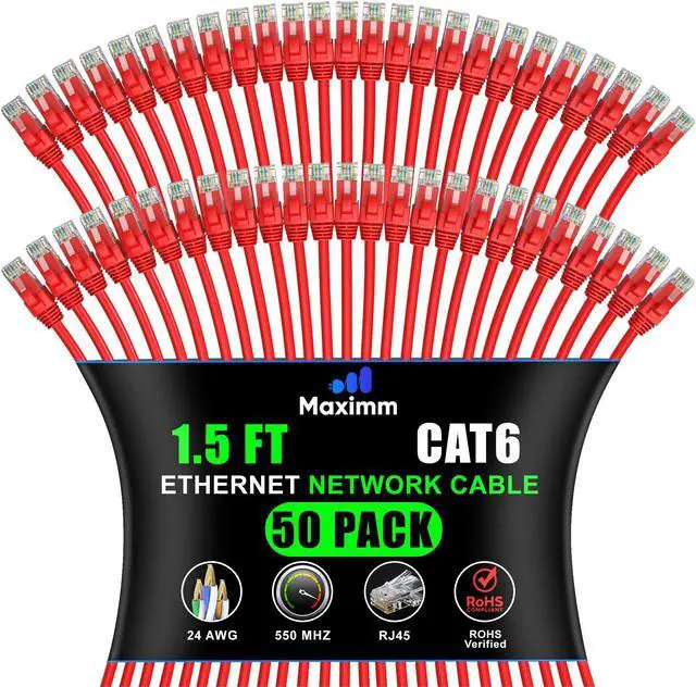 Maximm Cat 6 Ethernet Cable 1.5 ft (50-Pack) - High-Speed LAN Cable, Internet Cable, Patch Cable, and Network Cable - UTP, 10Gbps, 550MHz Ethernet Cord - Red