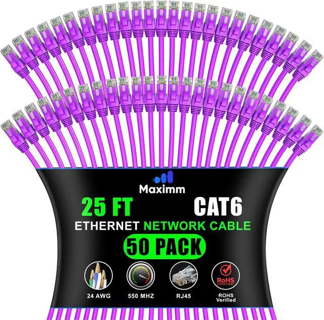 Maximm Cat 6 Ethernet Cable - 25 ft (50-Pack) - High-Speed LAN, Internet, Patch, and Network Cable - UTP, 10Gbps, 550MHz Ethernet Cord - Purple