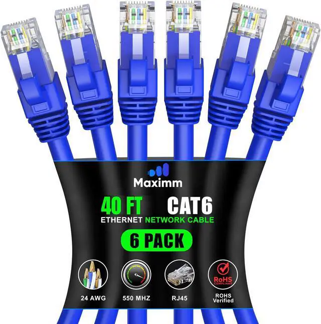 Maximm Cat 6 Ethernet Cable 40 ft (6-Pack) - High-Speed LAN Cable, Internet Cable, Patch Cable, and Network Cable - UTP, 10Gbps, 550MHz Ethernet Cord - Blue