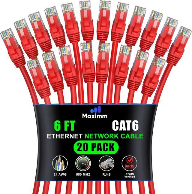 Maximm Cat 6 Ethernet Cable 6 ft (20-Pack) - High-Speed LAN Cable, Internet Cable, Patch Cable, and Network Cable - UTP, 10Gbps, 550MHz Ethernet Cord - Red
