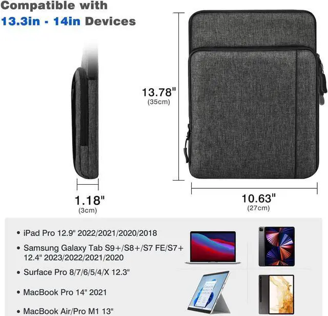 Compatibility up to 14": Compatible with iPad Pro 13" M4 2024, iPad Air 13" M2 2024, iPad Pro 12.9 M2 6th 5th 4th 3rd Gen(2022-2018); Surface Pro 9 8 X 13", Surface Pro 7+ 7 6 5 4 12.3"; Samsung Galaxy Tab S10+ Plus S9 FE+ S9+ Plus S8+ S7 FE S7+ 12.4" 2024 2023 2022 2021 2020; reMarkable Paper Pro 11.8"; 13-13.6 Inch MacBook Pro Air 2016-2024, 14 Inch MacBook Pro M4 2024; Huawei MateBook 12", etc.