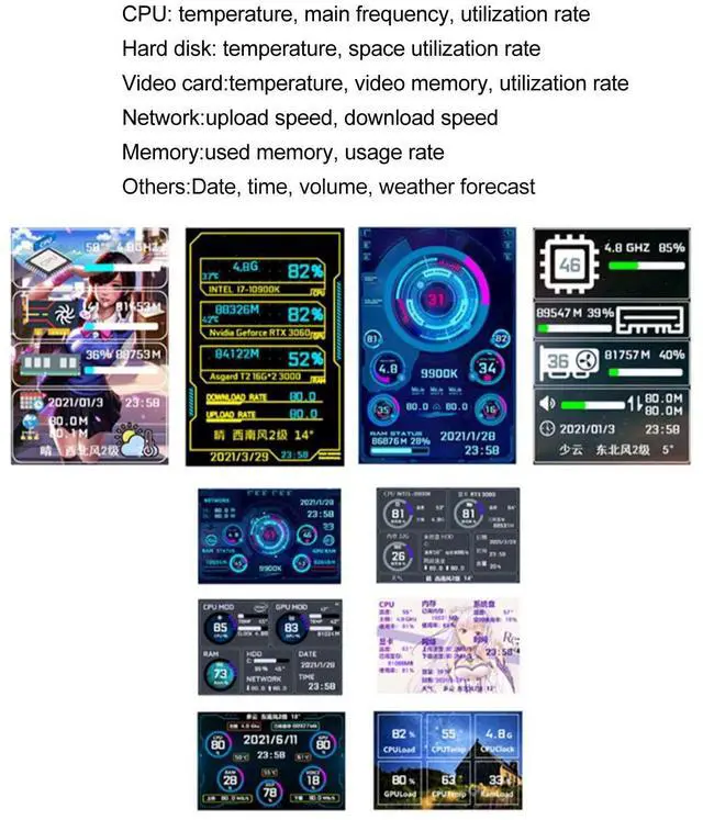 Real Time Data Monitoring: CPU: temperature, main frequency, utilization rate, network: upload speed, download speed, hard disk: temperature, space utilization, memory: used memory, utilization rate, graphics card: temperature, video memory, utilization rate, other: date, time, volume, weather forecast.