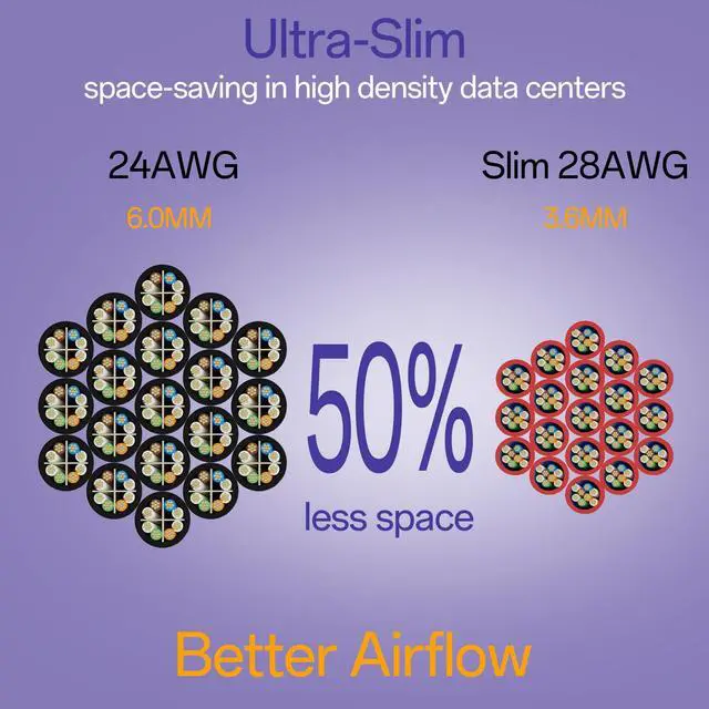 Ultra-Slim: Slim CAT6 patch cord is 50% thinner than standard networking cables. Slim Cat6 UTP patch cable is designed for space-saving in high density environments such as data centers telecommunication and server rooms.