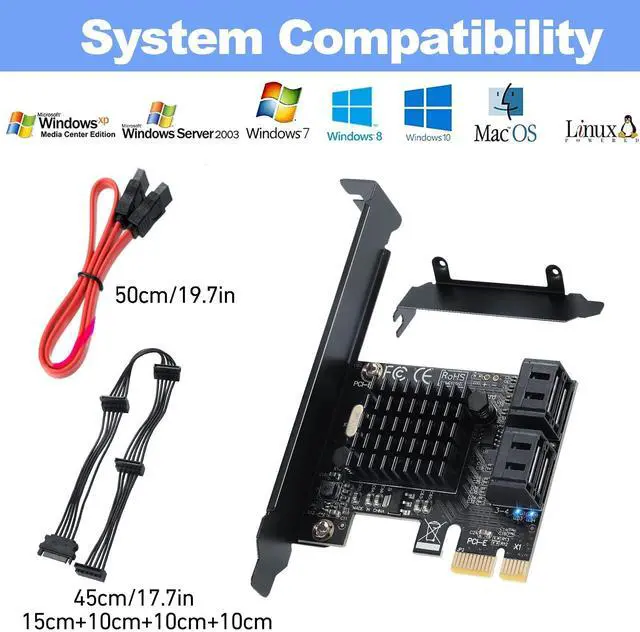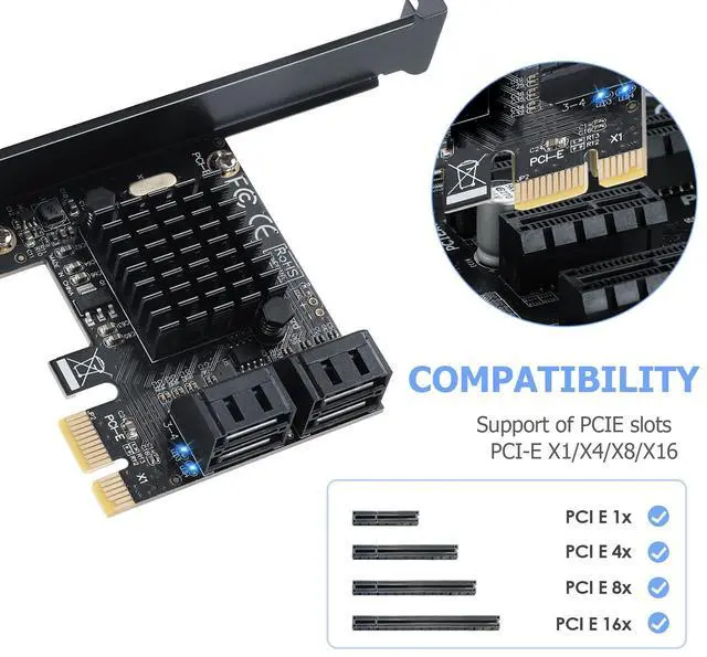 Compatible slots and systems: SATA controller PCI-E X1 interface compatible with 1X/4X/8X/16 slots (transfer speeds up to SATA III 6 Gbit/s). Supports Windows 7/8/10/XP/2003/2008/Linux.