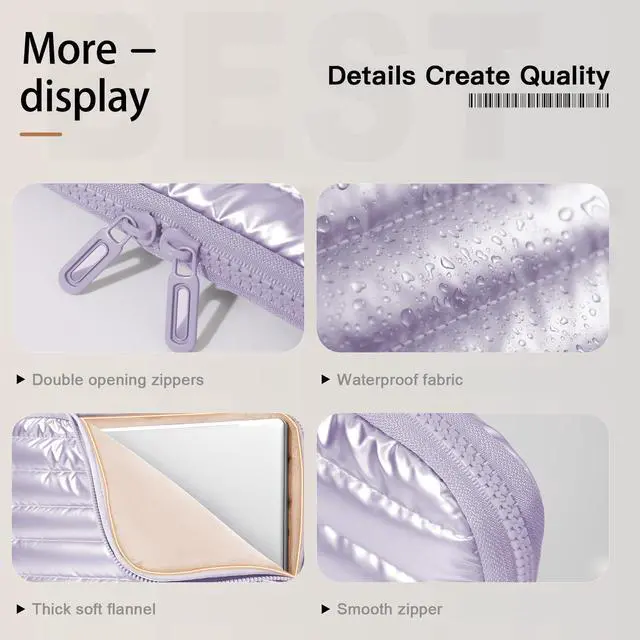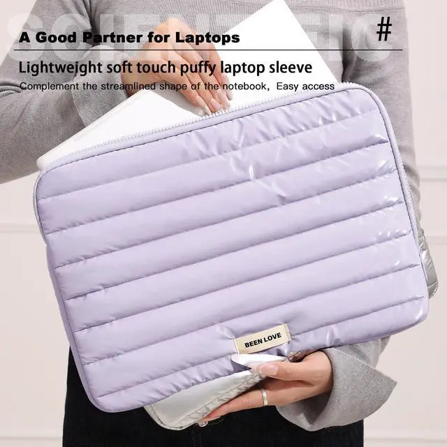 MATERIAL:Made with soft down jacket fabric , features thick shock-absorbing cottonadding layer and flannel fabric lining. Protect your laptop from bump, shock and accidental scratches
