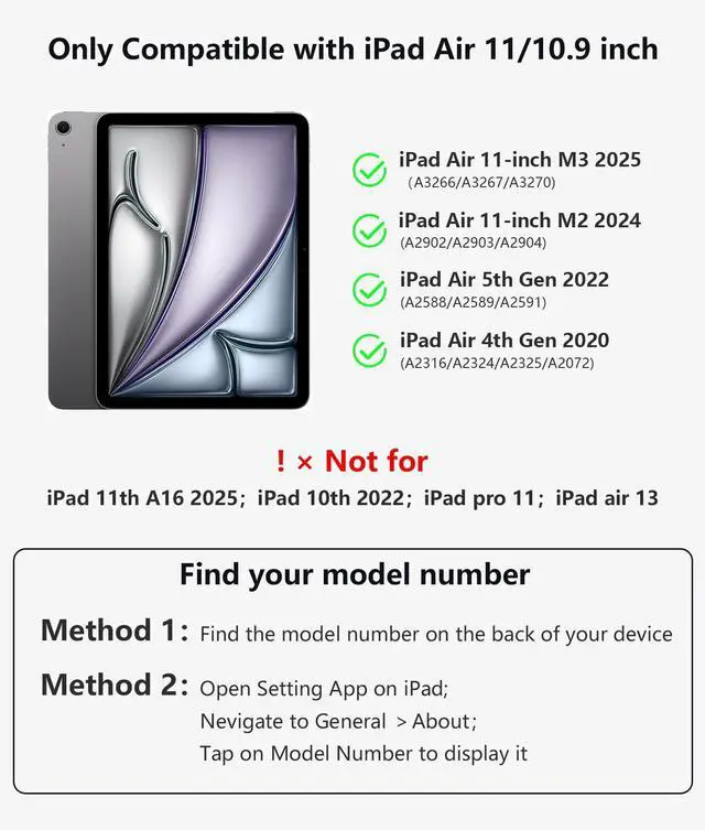 Compatible with iPad Air Series: This air keyboard case is compatible with iPad Air 11-inch (M2) 2024 (Model Number: A2902 / A2903/ A2904), for iPad Air 11-inch (M3) 2025 (A3266 / A3267/ A3270), for iPad Air 5th Generation 2022 10.9 inch (A2589/A2591/A2588), for iPad Air 4th generation 2020 10.9 inch (A2072/ A2316 / A2324 / A2325). Not compatible with any other devices, please check the back bottom of your tablet carefully to find the Model Number before purchase