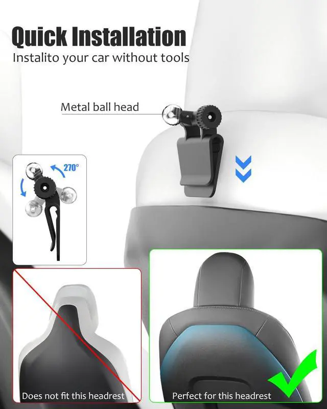 [(Metal Ball Head is Not Easy to Break)] The metal ball head of the Tesla headrest iPad mount has 360deg adjustment function, is not easy to break and is durable. High-quality materials, more peace of mind. Tesla back seat tablet holder is made of high-quality ABS material and has silicone pads on both sides to protect the surface of electronic devices from scratches.