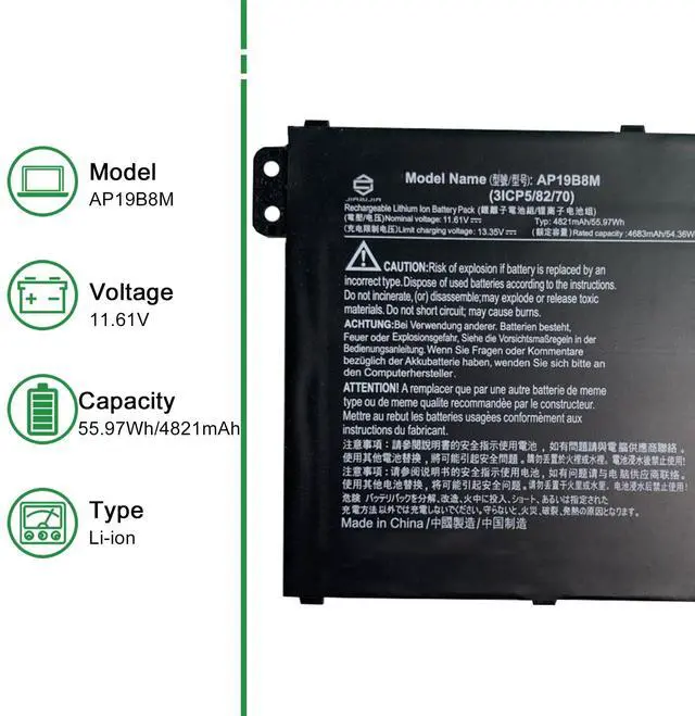 • Model: AP19B8M // Voltage: 11.61V // Capacity: 55.97Wh 4821mAh // Color: Black // Type: Plug & Play Li-ion Battery.