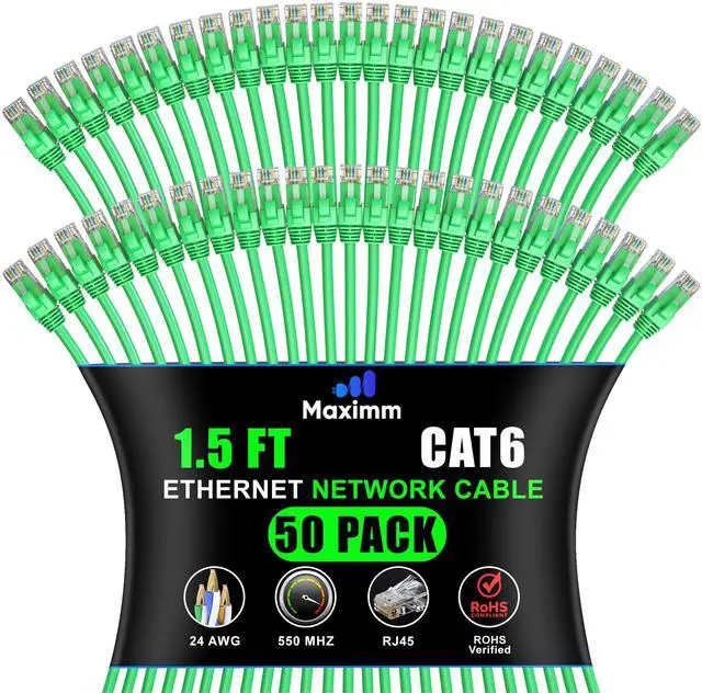 Maximm Cat 6 Ethernet Cable - 1.5 ft (50-Pack) - High-Speed LAN, Internet, Patch, and Network Cable - UTP, 10Gbps, 550MHz Ethernet Cord - Green