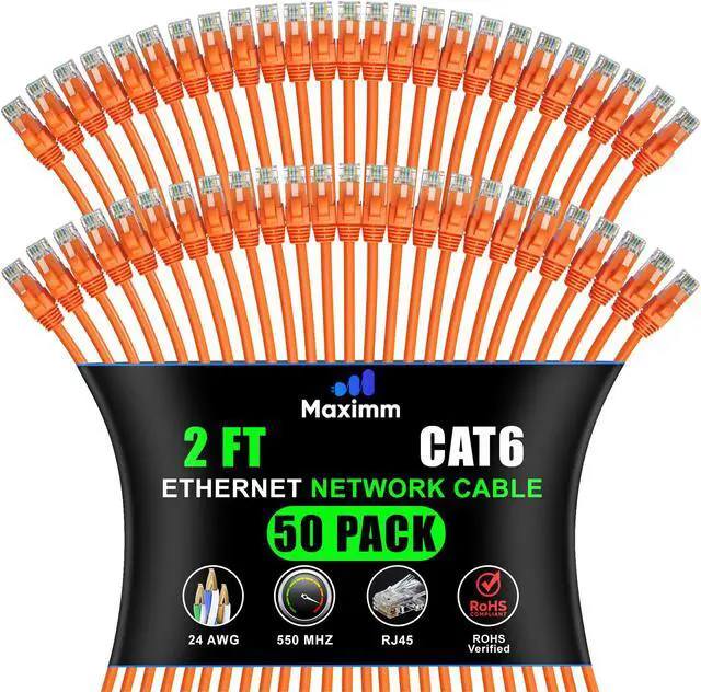Maximm Cat 6 Ethernet Cable 2 ft (50-Pack) - High-Speed LAN Cable, Internet Cable, Patch Cable, and Network Cable - UTP, 10Gbps, 550MHz Ethernet Cord - Orange