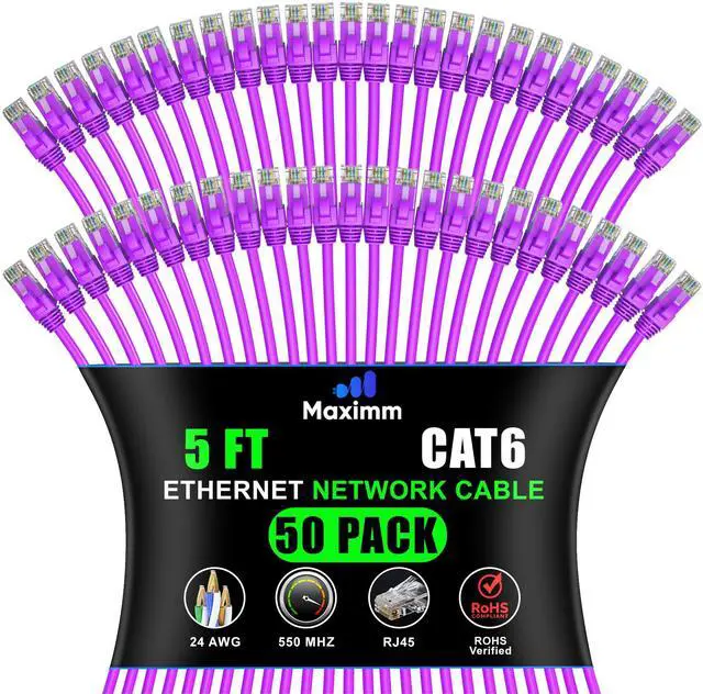 Maximm Cat 6 Ethernet Cable - 5 ft (50-Pack) - High-Speed LAN, Internet, Patch, and Network Cable - UTP, 10Gbps, 550MHz Ethernet Cord - Purple