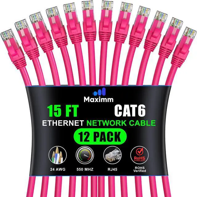 Maximm Cat 6 Ethernet Cable - 15 ft (12-Pack), High-Speed LAN, Internet, Patch, and Network Cable - UTP, 10Gbps, 550MHz Ethernet Cord - Pink