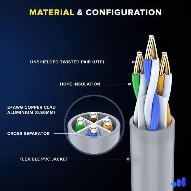 • UTP (Unshielded Twisted Pair) 4 pairs strand with separator for reduced crosstalk, molded snagless rubber boot and strain relief