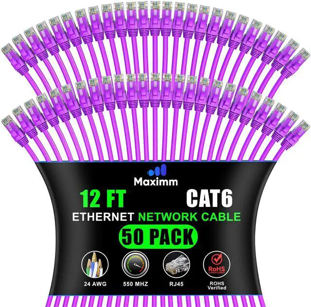 Maximm Cat 6 Ethernet Cable - 12 ft (50-Pack), High-Speed LAN, Internet, Patch, and Network Cable - UTP, 10Gbps, 550MHz Ethernet Cord - Purple