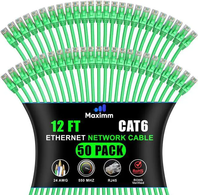 Maximm Cat 6 Ethernet Cable - 12 ft (50-Pack) - High-Speed LAN, Internet, Patch, and Network Cable - UTP, 10Gbps, 550MHz Ethernet Cord - Green