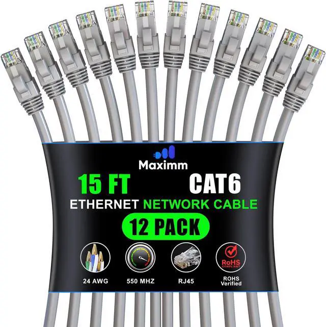 Maximm Cat 6 Ethernet Cable - 15 ft (12-Pack) - High-Speed LAN, Internet, Patch, and Network Cable - UTP, 10Gbps, 550MHz Ethernet Cord - Gray