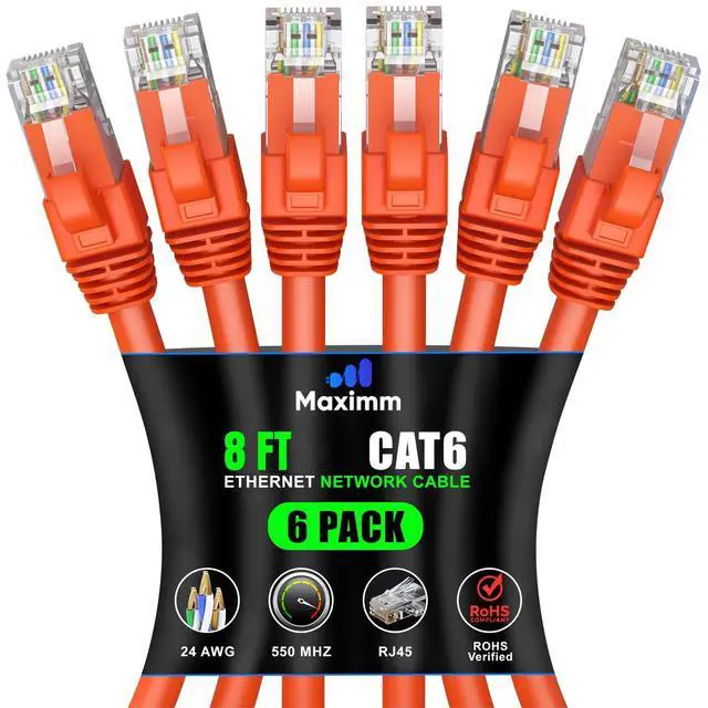 Maximm Cat 6 Ethernet Cable 8 ft (6-Pack) - High-Speed LAN Cable, Internet Cable, Patch Cable, and Network Cable - UTP, 10Gbps, 550MHz Ethernet Cord - Orange