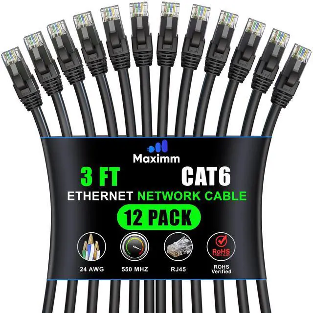 Maximm Cat 6 Ethernet Cable 3 Ft, (12-Pack) Cat6 Cable, LAN Cable, Internet Cable, Patch Cable and Network Cable - UTP (Black) 3 Feet ethernet Cord