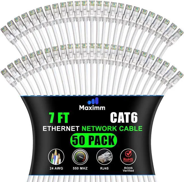 Maximm Cat 6 Ethernet Cable 7 Ft, (50-Pack) Cat6 Cable, LAN Cable, Internet Cable, Patch Cable and Network Cable - UTP (White) 7 Feet ethernet Cord