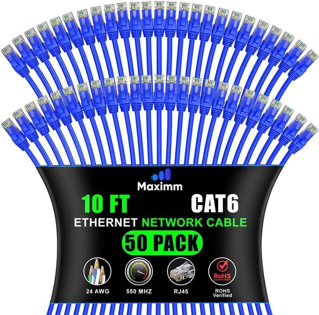 Maximm Cat 6 Ethernet Cable - 10 ft (50-Pack) - High-Speed LAN, Internet, Patch, and Network Cable - UTP, 10Gbps, 550MHz Ethernet Cord - Blue