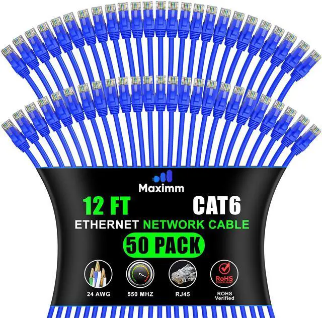 Maximm Cat 6 Ethernet Cable - 12 ft (50-Pack) - High-Speed LAN, Internet, Patch, and Network Cable - UTP, 10Gbps, 550MHz Ethernet Cord - Blue