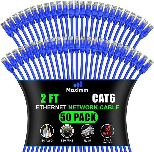 Maximm Cat 6 Ethernet Cable - 2 ft (50-Pack) - High-Speed LAN, Internet, Patch, and Network Cable - UTP, 10Gbps, 550MHz Ethernet Cord - Blue