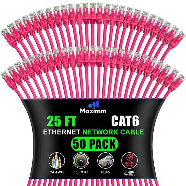 Maximm Cat 6 Ethernet Cable - 25 ft (50-Pack) - High-Speed LAN, Internet, Patch, and Network Cable - UTP, 10Gbps, 550MHz Ethernet Cord - Pink