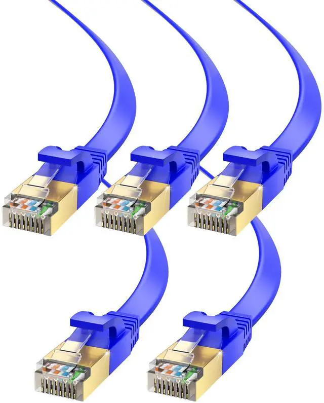 Maximm Cable CAT7 Flat Ethernet Cable, 5 Pack (Blue, 20ft) 10 Gbps, 600 MHz, Shielded RJ45 Gold Connectors Ultra-Thin Flexible Design for Home & Office Networking