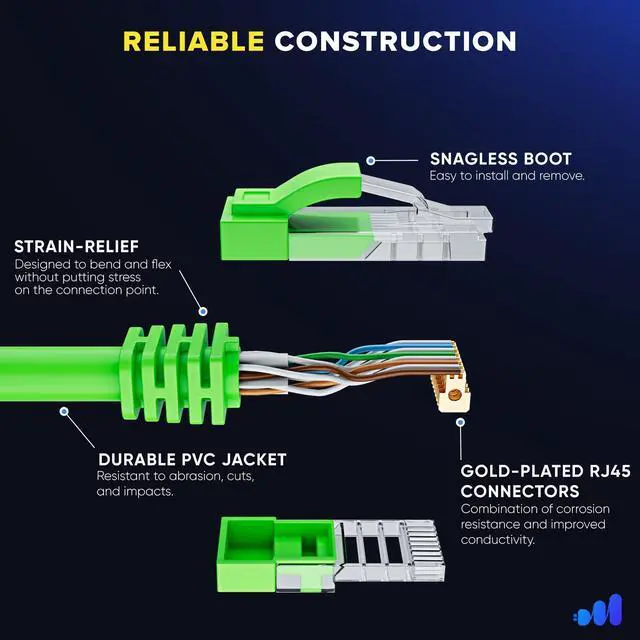 24AWG copper-clad aluminum conductor ( 0.50 mm), HDPE insulation, PVC jacket, gold-plated RJ45 connectors ^^ UTP (Unshielded Twisted Pair) 4 pairs strand with separator for reduced crosstalk, molded snagless rubber boot and strain relief ^^ High Speed up to 550 MHz bandwidth, 10Gbps, 10BASE-T, Fast Ethernet 100BASE-TX, Gigabit Ethernet 1000BASE-T/1000BASE-TX, and 10-Gigabit Ethernet 10GBASE-T ^^ ANSI/TIA-568-C. 2 compliant, REACH and RoHS compliant, 1-Year warranty ^^ Compatible with PC, laptop, computer server, LAN-connected printer, router, modem, networking switch boxes, network media player, streaming devices, network attached storage (NAS)