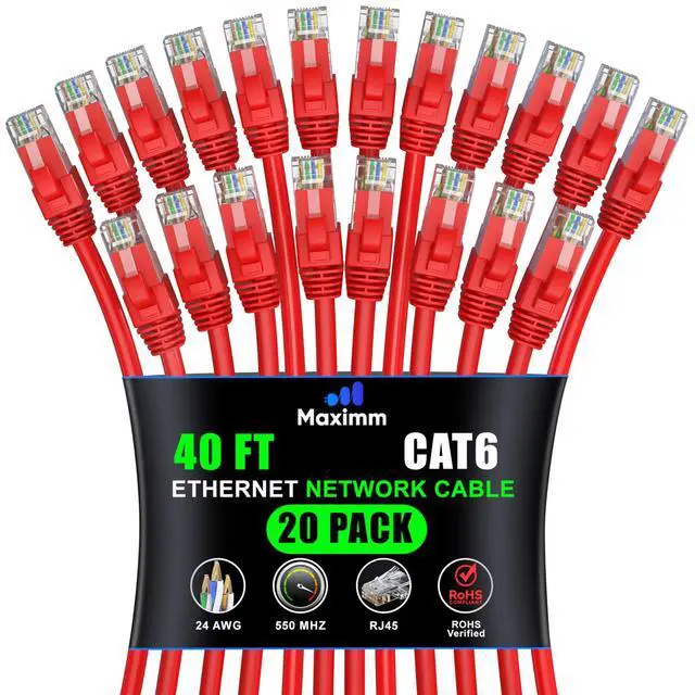 Maximm Cat 6 Ethernet Cable 40 ft (20-Pack) - High-Speed LAN Cable, Internet Cable, Patch Cable, and Network Cable - UTP, 10Gbps, 550MHz Ethernet Cord - Red