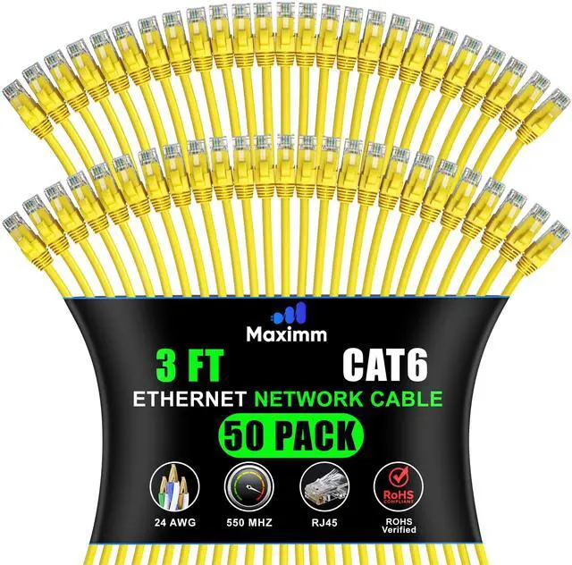 Maximm Cat 6 Ethernet Cable - 3 ft (50-Pack) - High-Speed LAN, Internet, Patch, Network Cable - UTP, 10Gbps, 550MHz Ethernet Cord - Yellow