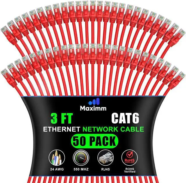 Maximm Cat 6 Ethernet Cable 3 ft (50-Pack) - High-Speed LAN, Internet, Patch, and Network Cord - UTP, 10Gbps, 550MHz - Red