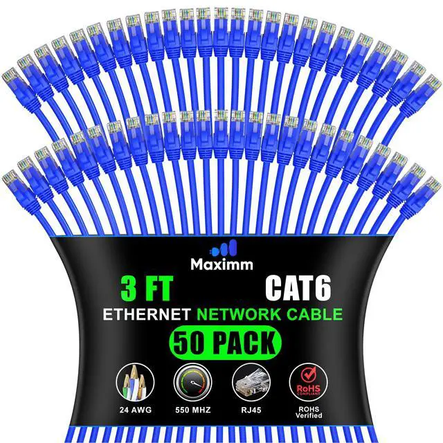 Maximm Cat 6 Ethernet Cable 3 Ft, (50-Pack) Cat6 Cable, LAN Cable, Internet Cable, Patch Cable and Network Cable - UTP (Blue) 3 Feet ethernet Cord
