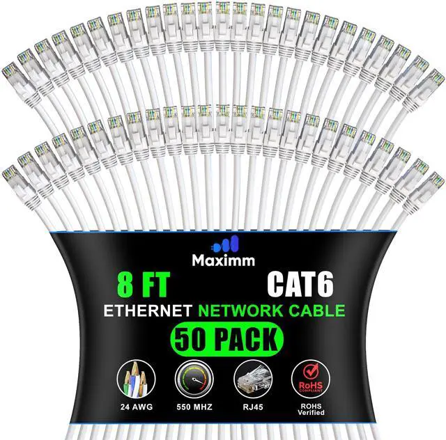 Maximm Cat 6 Ethernet Cable - 8 ft (50-Pack) - High-Speed LAN, Internet, Patch, and Network Cable - UTP, 10Gbps, 550MHz Ethernet Cord - White