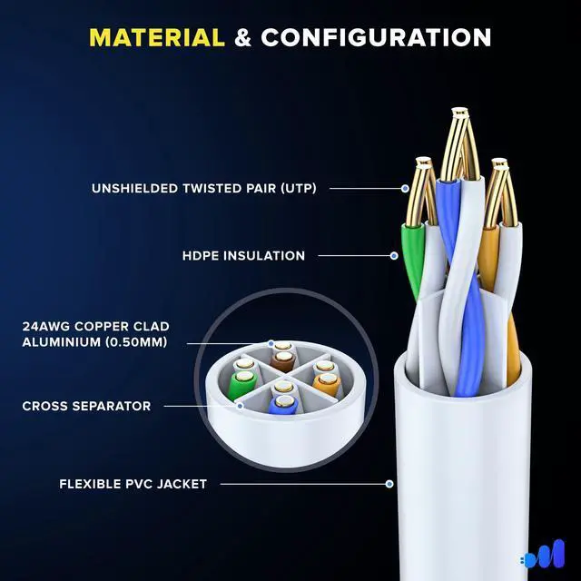 24AWG copper-clad aluminum conductor ( 0.50 mm), HDPE insulation, PVC jacket, gold-plated RJ45 connectors ^^ UTP (Unshielded Twisted Pair) 4 pairs strand with separator for reduced crosstalk, molded snagless rubber boot and strain relief ^^ High Speed up to 550 MHz bandwidth, 10Gbps, 10BASE-T, Fast Ethernet 100BASE-TX, Gigabit Ethernet 1000BASE-T/1000BASE-TX, and 10-Gigabit Ethernet 10GBASE-T ^^ ANSI/TIA-568-C. 2 compliant, REACH and RoHS compliant, 1-Year warranty ^^ Compatible with PC, laptop, computer server, LAN-connected printer, router, modem, networking switch boxes, network media player, streaming devices, network attached storage (NAS)