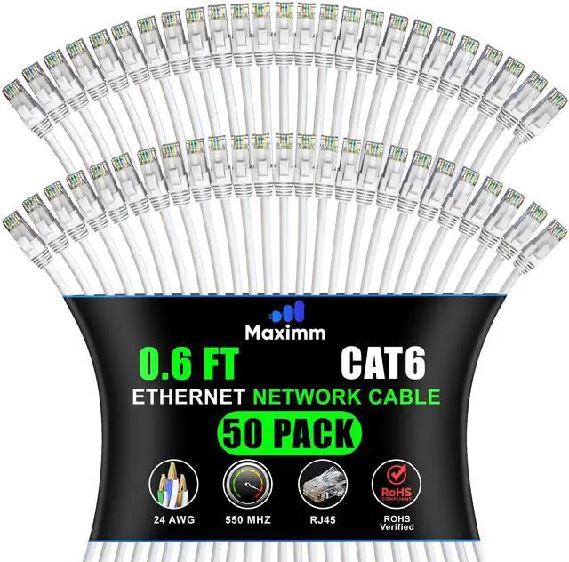 Maximm Cat 6 Ethernet Cable - 0.6 ft (50-Pack) - High-Speed LAN, Internet, Patch, and Network Cable - UTP, 10Gbps, 550MHz Ethernet Cord - White