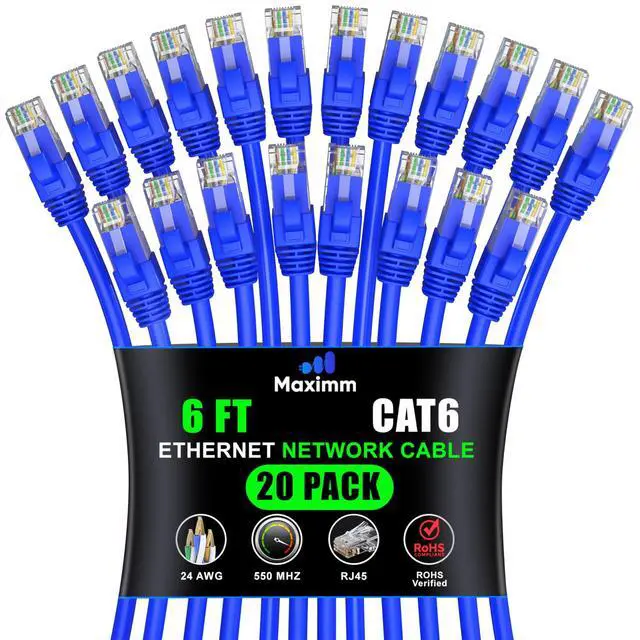 Maximm Cat 6 Ethernet Cable 6 ft (20-Pack) - High-Speed LAN Cable, Internet Cable, Patch Cable, and Network Cable - UTP, 10Gbps, 550MHz Ethernet Cord - Blue