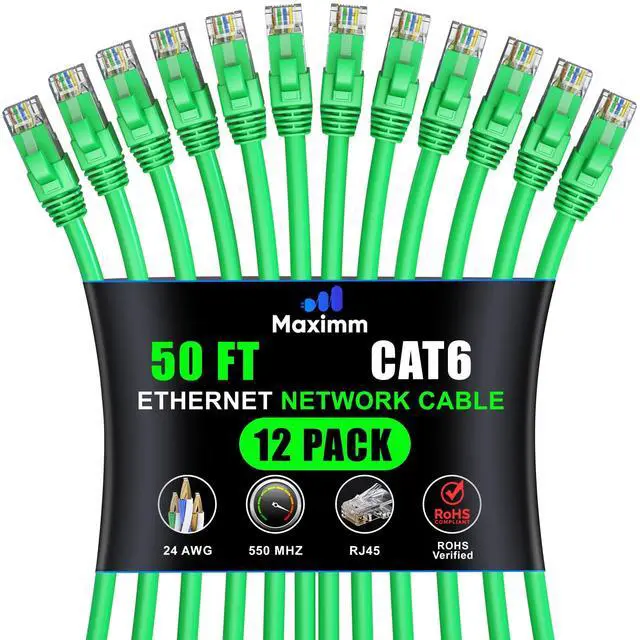 Maximm Cat 6 Ethernet Cable - 50 ft (12-Pack), High-Speed LAN, Internet, Patch, and Network Cable - UTP, 10Gbps, 550MHz - Green