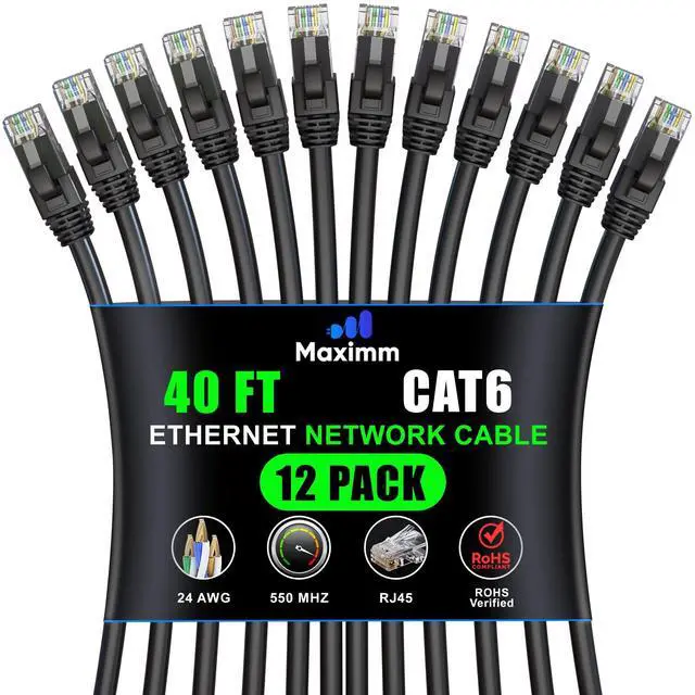 Maximm Cat 6 Ethernet Cable - 40 ft (12-Pack) - High-Speed LAN, Internet, Patch, and Network Cable - UTP, 10Gbps, 550MHz Ethernet Cord - Black