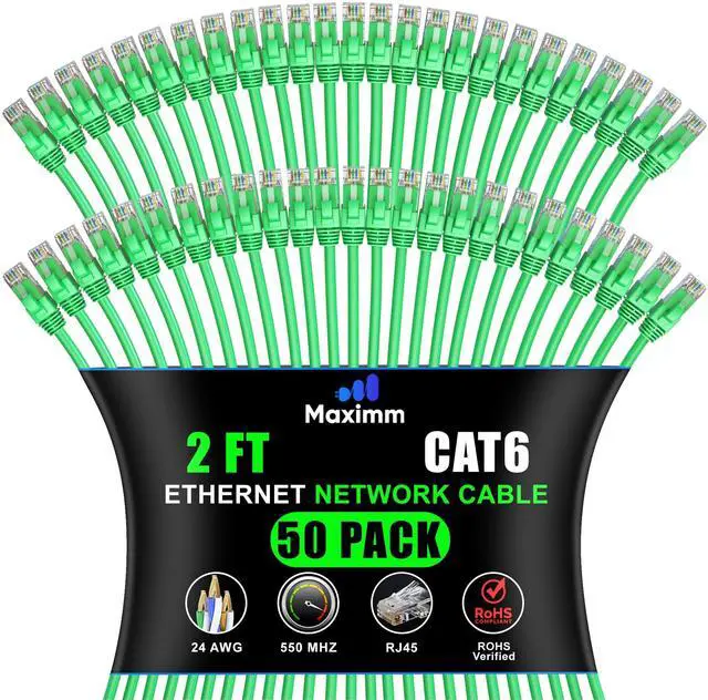 Maximm Cat 6 Ethernet Cable - 2 ft (50-Pack) - High-Speed LAN, Internet, Patch, and Network Cable - UTP, 10Gbps, 550MHz Ethernet Cord - Green