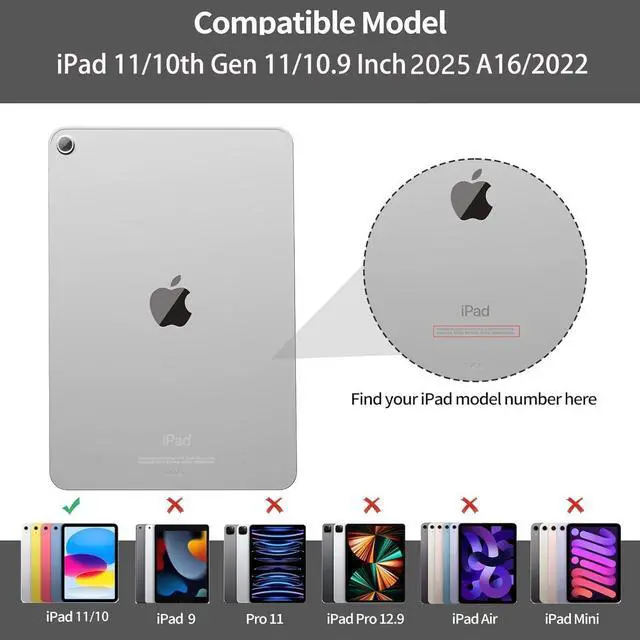 [(New iPad 11th/10th Generation Case with Keyboard 11/10.9 Inch)] This keyboard case compatible with iPad 11th Generation 11 inch 2025 (Model Number:A3354/A3355/A3356), compatible with iPad 10th Gen 10.9 inch 2022 (Model Number:A2696/A2757/A2777). Not for any other models. Please check the model number on the back of your iPad before purchasing a case