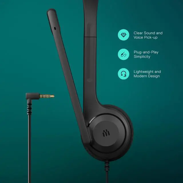 The EPOS C1 with 3.5 mm jack is an upgraded on-ear headset for hybrid workers and casual users, delivering clear voice pickup, excellent audio quality, and lightweight comfort. Ideal for PC, mobile, or tablet use with no setup required. Features a noise-canceling microphone, adjustable headband, and eco-conscious packaging.