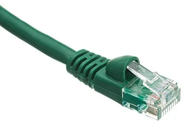 This particular cable is a green UTP (Unshielded Twisted Pair) patch cable with molded boots (snagless installation) and extra protection for the RJ45 connector and clip. Cat6 cable includes a spline to help ensure separation between the pairs which limits cross talk. The connectors are wired to the T568B standard. The individual conductors are 24 AWG (American wire gauge) stranded pure copper. Cat6 patch cables are stranded to improve flexibility. Pure copper conductors provide the best signal possible. The RJ45 plug features gold connectors to prevent corrosion thus ensuring a longer cable life.