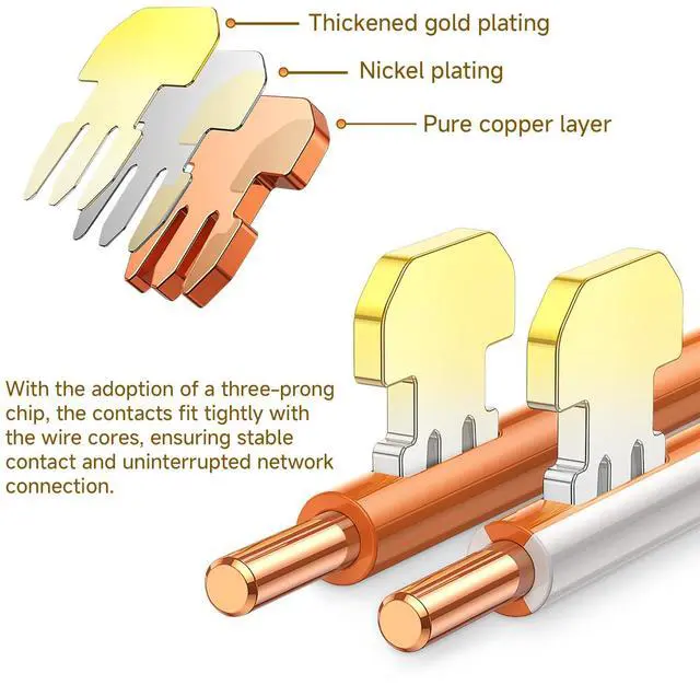 Pass through design simplifies teminations Gold-plated contacts on the 8P8C network connectors provide superior transmission and resist Cat6A cable corrosion