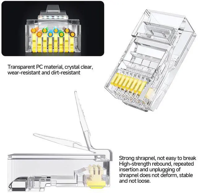 Cat 6 RJ45 pass through connector terminates unshielded twisted pair cable for making a custom-length Cat 6 Ethernet cable Without breaking the bank.; Supports 23-24 AWG round or flat stranded wire, with 0.9 to 1.1mm insulated conductors and an outside diameter of up to 6.3mm