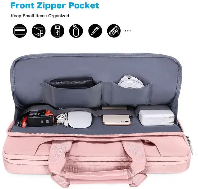 Matching color removable and adjustable padding shoulder strap varied from 29.5 - maximum 52.3 inch, top handles also can tuck away in the pockets when not needed. Large front pocket with inner small pocket keep all your daily accessories well organized. Proviode enough space to keep mouse, pens, mobile phone, cables, cards and other small accessories.