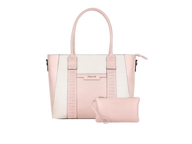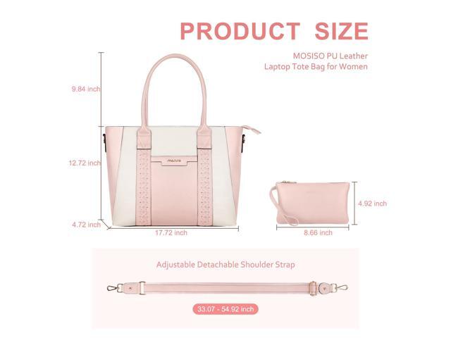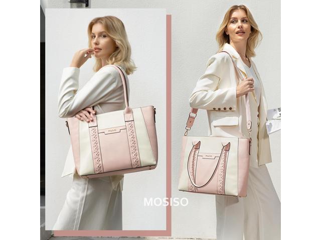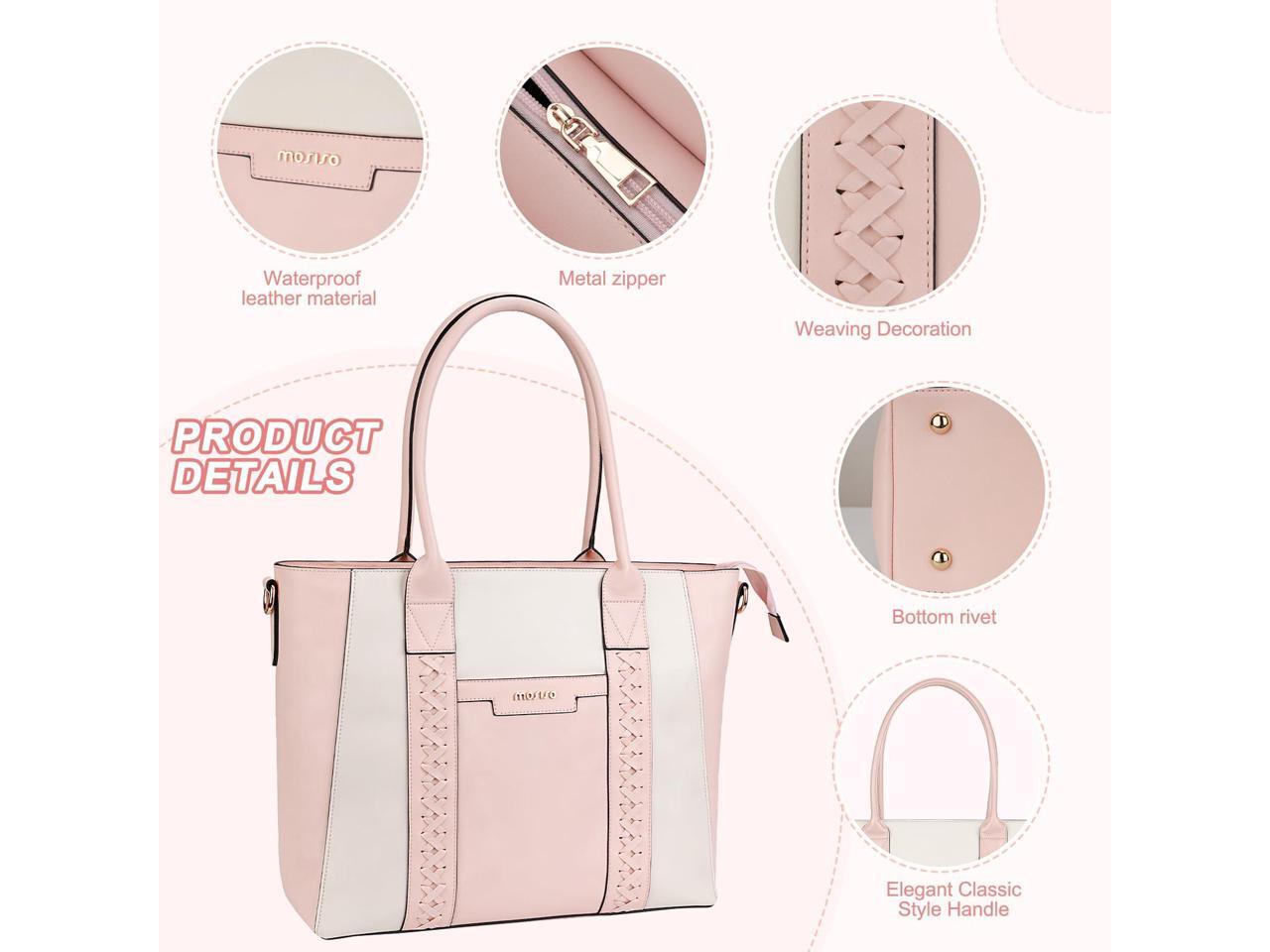 MOSISO Laptop Tote Bag for Women, 15.6 inch PU Leather Work Bag with Double Weave Strips & Clutch Purse, Waterproof Computer Briefcase Shoulder Handbag for Business Office, Pink