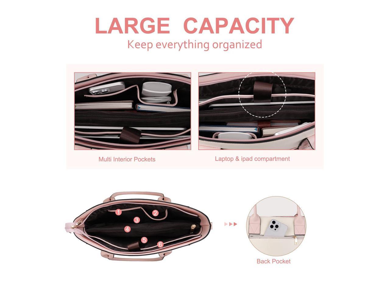 - Large Capacity Multiple Compartments. Holds your laptop, tablet and everything you need. Roomy enough with 3 compartments and various pockets for well organized. Extra small clutch purse to keep your mobile phone, keys, cards, and makeup. Whether you are working, commuting, or daily use, It is an ideal bag for women on the go.