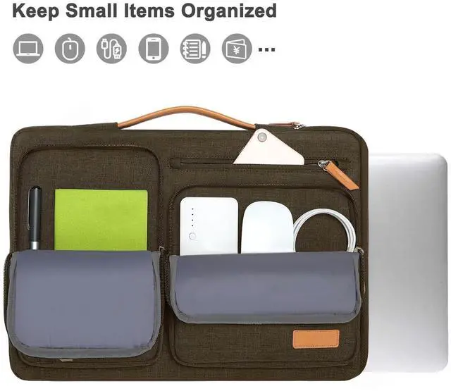 360 degree all around protective reinforced interior edge briefcase carrying case bag protect your laptop from any accidental dropping. Extendable handle design makes it to carry your laptop around in comfort, you can also tuck away the handle. Side opening zipper design, avoid accidental dropping of your laptop while carrying. 4 front zipper pockets provide enough space to keep mouse, earphone, pens and notepads, offering added convenience.